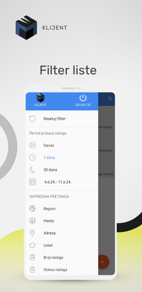 - Monitoring - pregled svih naloga uz mogućnost filtriranja pregleda prema željenom periodu, statusu naloga regionu, mestu ...