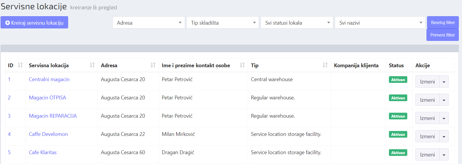 Mi smo za vas kreirali centralno skladište i još neka koja smatramo da su neophodna, na Vama je da kreirate potrebne magacije, servisne lokacije klijenata, dobavljače i slično.