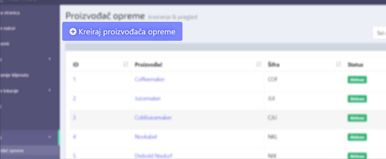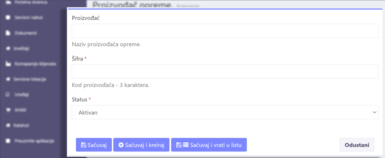 Klikom na dugme “Kreiraj proizvođača opreme” (u okviru sekcije: Proizvođač opreme) otvara se forma za kreiranje novog proizvođača opreme.