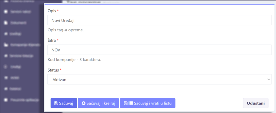- Opcija “Odustani” - Vas vraća na stranicu tag opreme bez čuvanja podataka.