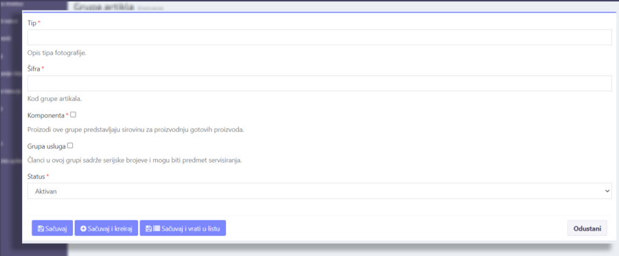 Klikom na dugme “Kreiraj grupu artikala” (u okviru sekcije Grupe artikala) otvara se forma za kreiranje nove grupe artikala.