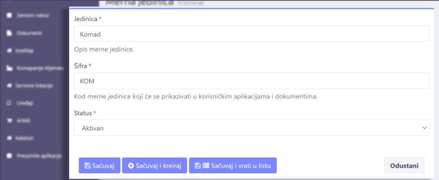 - Opcija “Sačuvaj i kreiraj” - čuva upisane podatke i potom otvara novu formu za kreiranje nove merne jedinice. Ova opcija može biti od pomoći prilikom bržeg i lakšeg unosa većeg broja mernih jedinica.