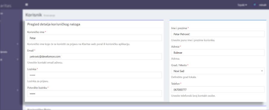 Prilikom kreiranja korisnika dodeljuju se korisničke role u skladu sa ulogama korisnika, kao i osnovni podaci o korisniku.